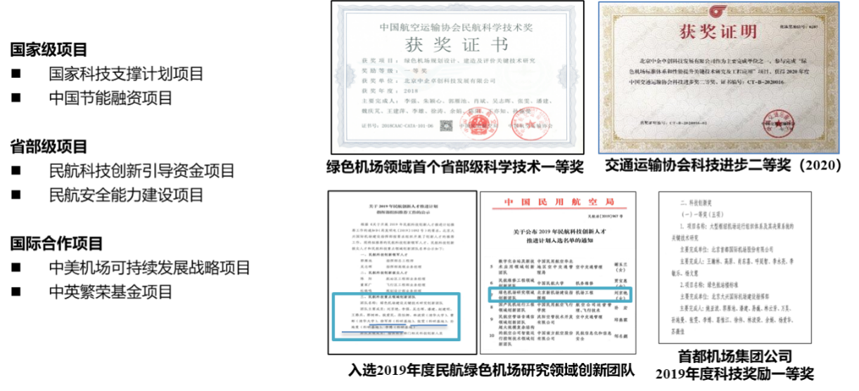 1)“绿色机场规划设计建造及评价关键技术研究”获得2018年度中国航空运输协会民航科学技术奖一等奖