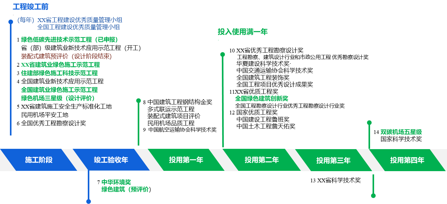 在绿色机场建设领域,我们秉持“1+N”模式,以基本建设程序为轴心,全方位拓展品质工程、绿色建筑、创优策划、四型机场、调研评估、五化实施、纲要规划、光伏规划、“双碳”实施、新能源车、环境监测等多元工作,形成上下延伸、虚实结合的立体化工作体系。