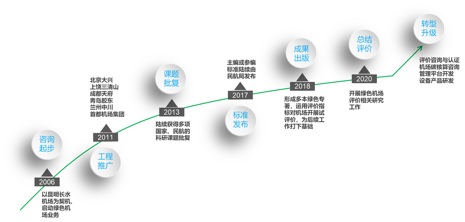 自2006年成立以来,我们始终致力于绿色机场领域的探索与发展,逐步形成了从理论研究到实践落地的完整发展路径。2006年,公司以“创始引领”为起点,开启了绿色机场建设的咨询起步阶段;2011年,通过“示范工程”建设,推动绿色机场理念在工程实践中落地;2013年,进入“科研创新”阶段,获批多项课题研究,为行业发展提供技术支撑;2017年,参与制定行业标准,推动“标准建立”,为绿色机场建设提供规范化指导;2018年,通过“成果发布”,将科研成果转化为实际应用,为行业提供可借鉴的经验;2021年,进行“平台开拓”,整合资源,推动绿色机场平台建设;2024年,迈向“转型升级”新阶段,持续深化绿色低碳发展,助力民航行业实现高质量发展。