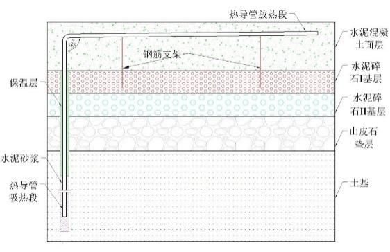 零能耗无机热导管自融雪道面技术无需任何外加热源,仅依靠埋入土基内部的无机热导管取热端来汲取地热能,并通过埋设在混凝土道面板内部的无机热导管散热端对道面板进行加热,使道面板温度长期保持在0℃以上,能够有效抑制道面积雪结冰。