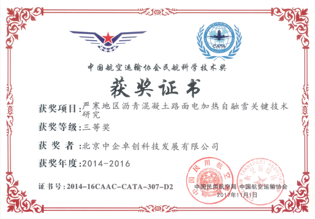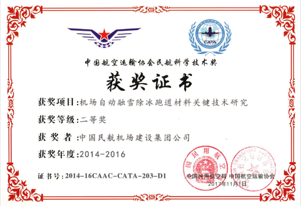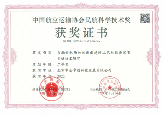 民航重大专项“自融雪机场加热道面建造工艺与配套装置关键技术研究”荣获2022年度中国航空运输协会民航科学技术奖二等奖。