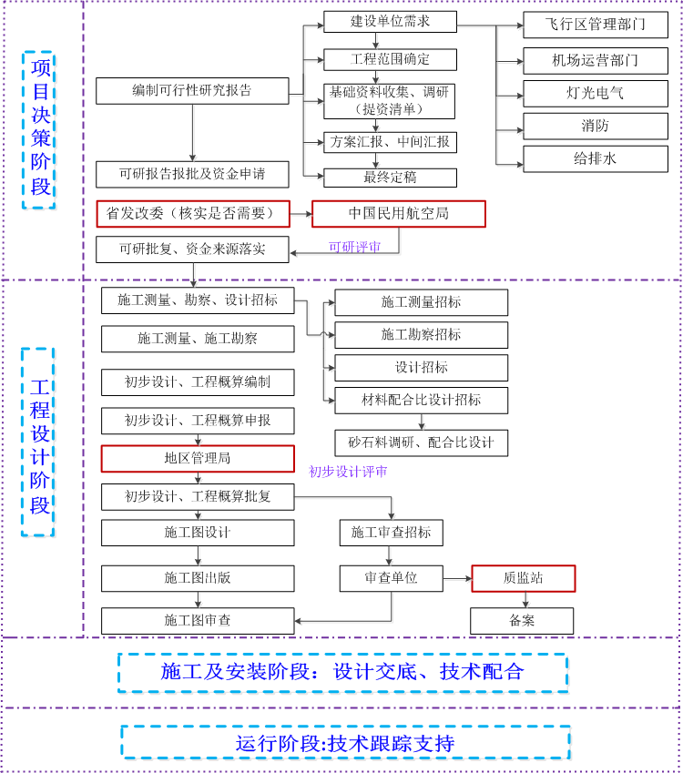 咨询设计流程涵盖需求锚定阶段(飞行区运行分析、多专业输入整合)、方案生成阶段(多维协同设计、动态优化决策)、工程实施阶段(设计交底、工程变更)、验证交付、运行跟踪等环节。