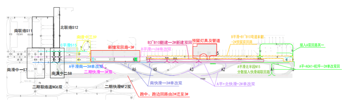 不停航施工可行性:充分考虑不停航施工要求,施工工艺要考虑与其他专业衔接。如管线敷设方案要结合场道改造方、排水盲沟设置位置以及管线综合等条件。