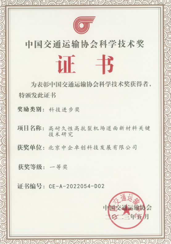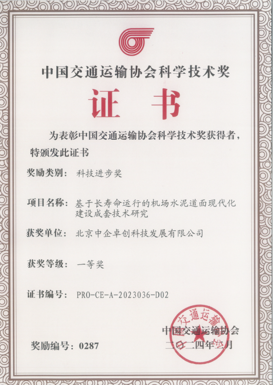荣获中国交通运输协会民航科学技术一等奖2项、二等奖1项,民航局科技进步奖二等奖2项,中交集团科技进步奖二等奖1项,中国公路学会科学技术三等奖1项。